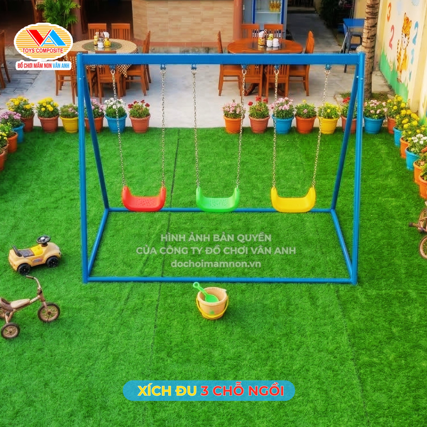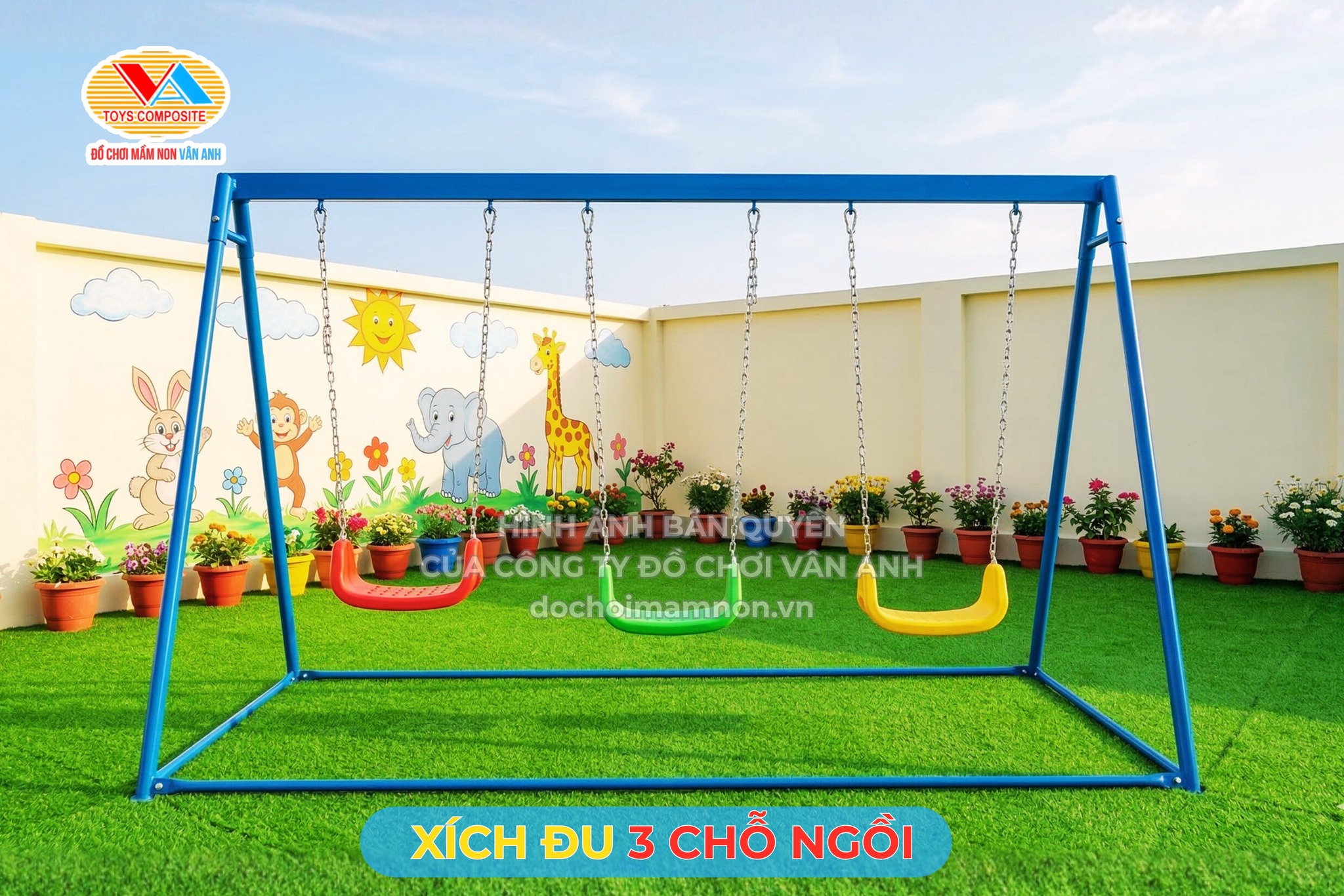 Trong các khu vui chơi trẻ em, việc bổ sung thêm những thiết bị đơn giản nhưng thu hút luôn là yếu tố quan trọng giúp không gian trở nên sinh động hơn. Xích đu mầm non 3 chỗ ngồi là một trong những thiết bị được nhiều trường mầm non, quán cafe sân vườn, khu vui chơi trẻ em và homestay lựa chọn.